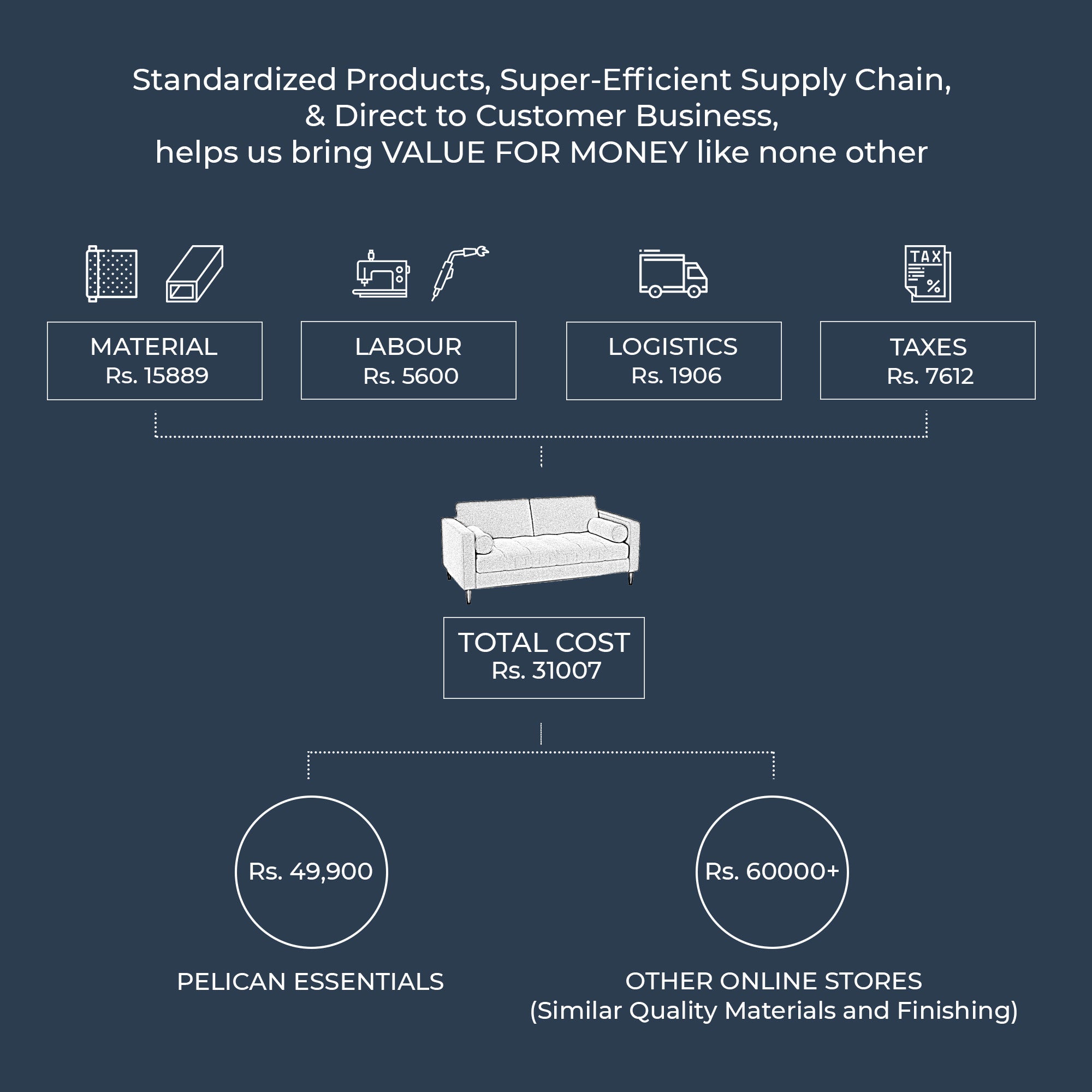 Pelican Sofas use materials that lasts and are verified throughly, all our foams are sourced from Duroflex or Sleepwell and we source our fabrics from brands like D'Decor and other leading manufacturers from the world.
